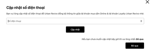 - Nếu Khách hàng đã có tài khoản mua sắm trên website Urban Revivo Việt Nam: Khách hàng chỉ cần đăng nhập trên website và cập nhật số điện thoại (trùng với số điện thoại của tài khoản Loyalty), hệ thống sẽ tự đồng bộ thông tin từ app MaisonOnline lên tài khoản của quý khách trên website MaisonOnline.vn. Xem hướng dẫn cụ thể tại mục 2.