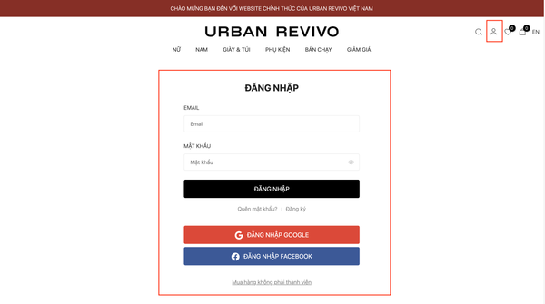 Bước 2: Nhập thông tin tài khoản Urban Revivo Việt Nam hoặc đăng ký mới nếu chưa có. (tham khảo tại bước 2)