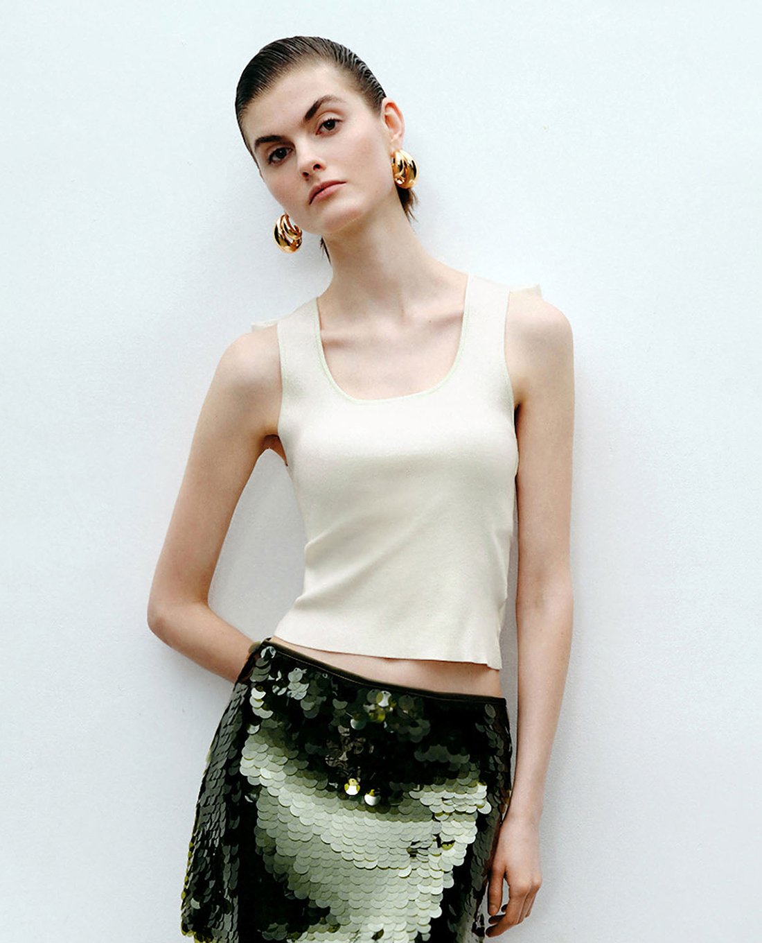 - Cổ chữ U cùng phom áo ôm tôn dáng