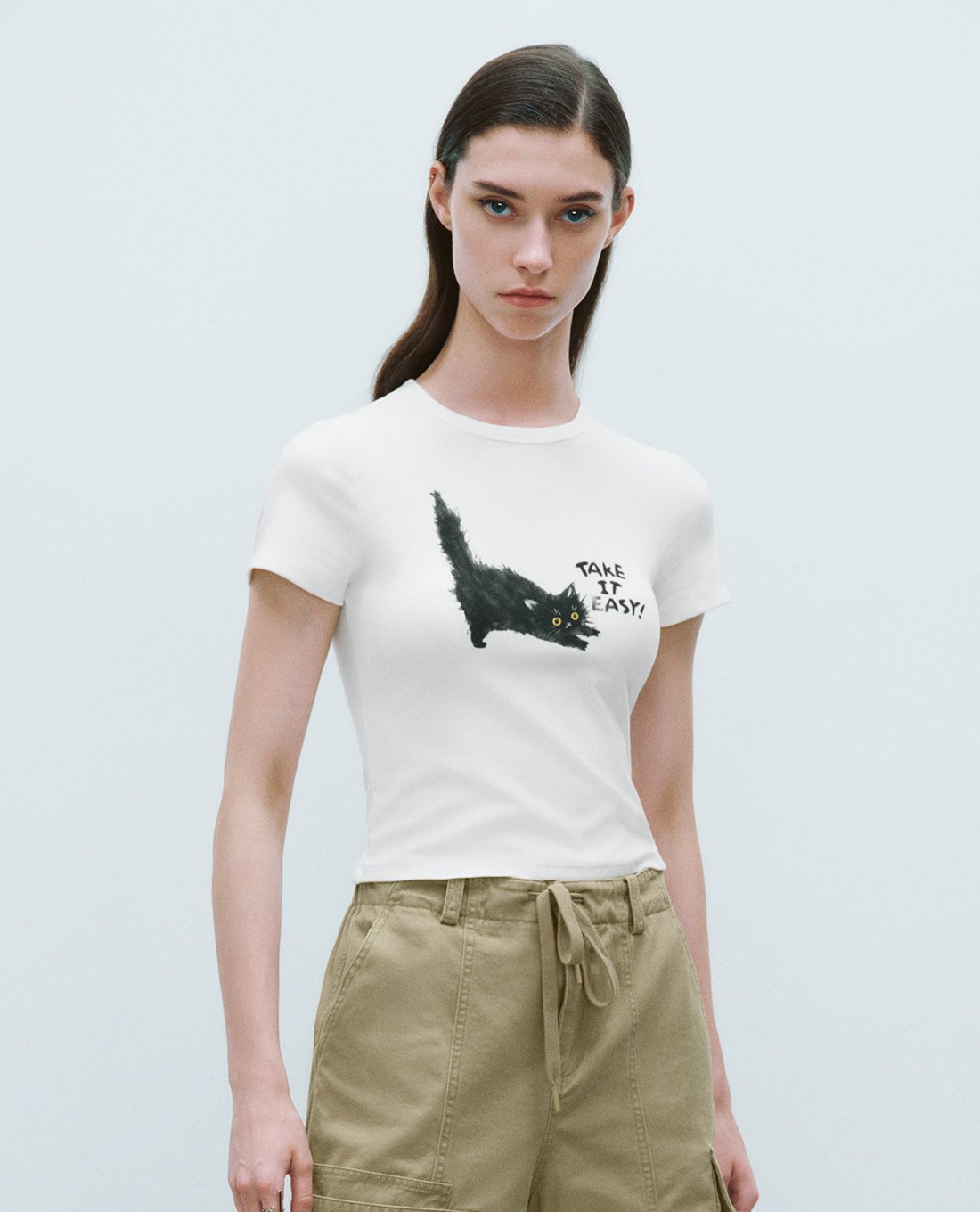 - Họa tiết in chú mèo đen cùng dòng chữ Take it easy nổi bật