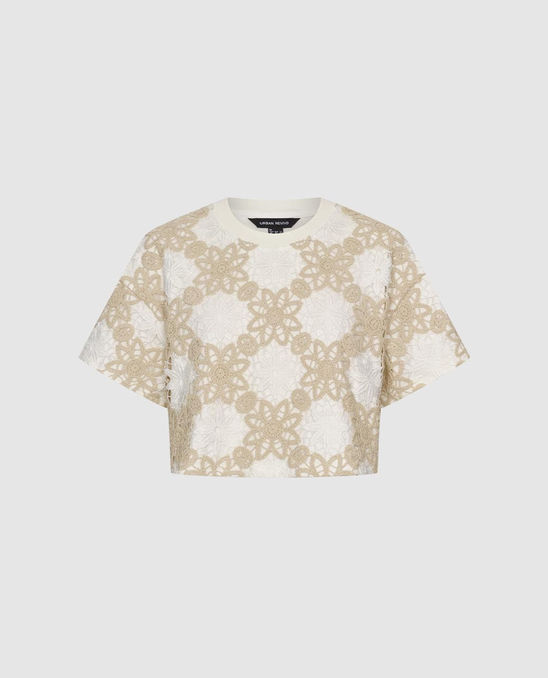 Áo croptop nữ cổ tròn tay ngắn phối hoa văn