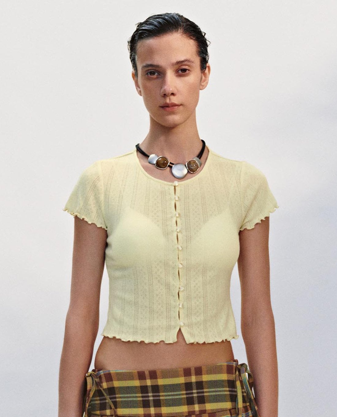 Áo croptop nữ cổ tròn tay ngắn phối nút