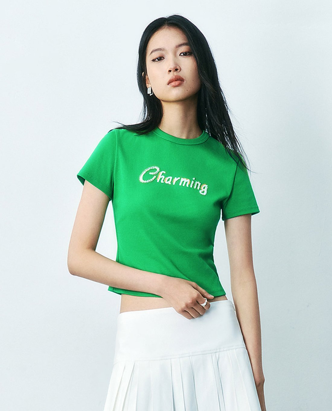 - Họa tiết chữ Charming đính sequin lấp lánh