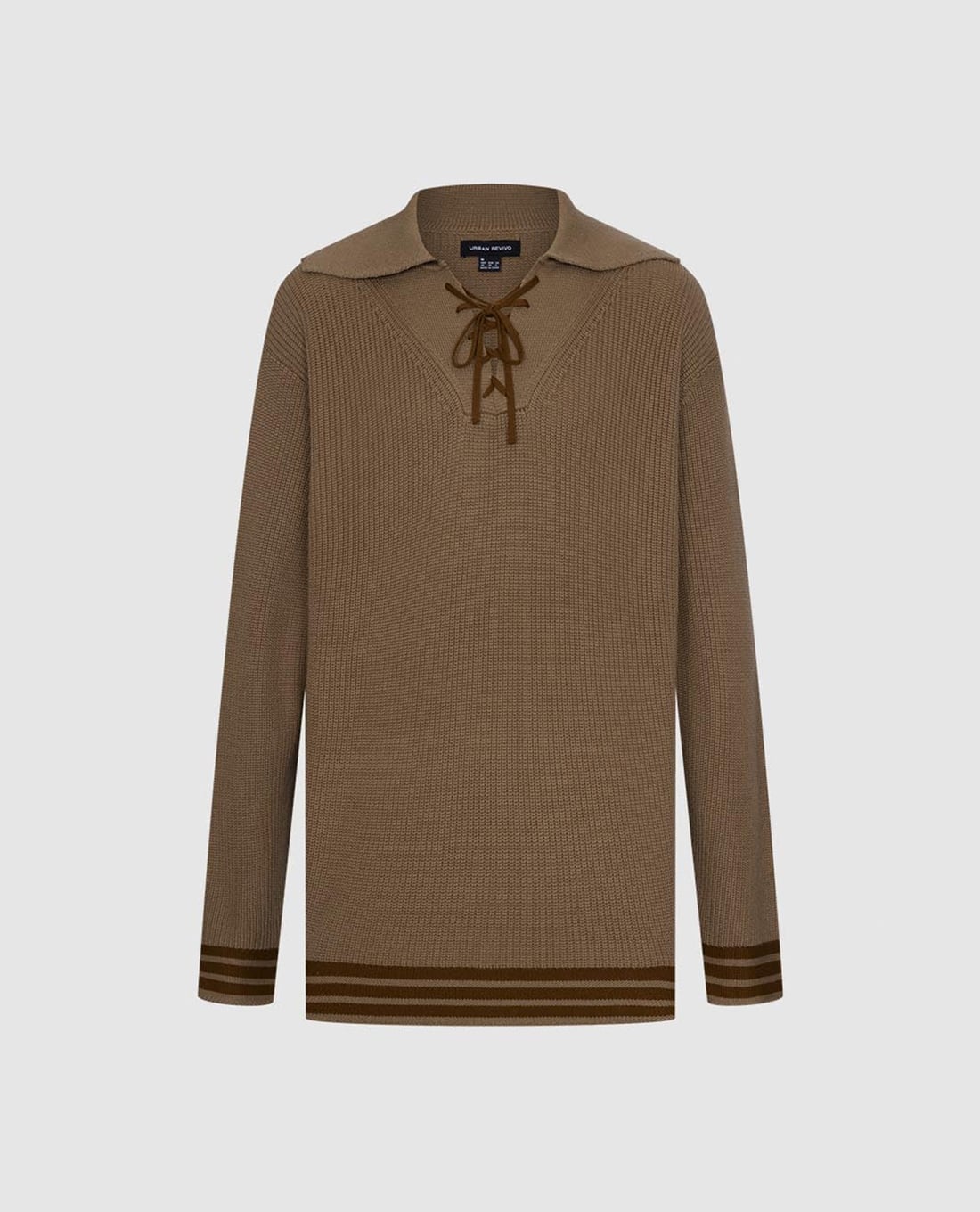 - Thiết kế áo dệt kim cổ bẻ kết hợp dây buộc tạo điểm nhấn