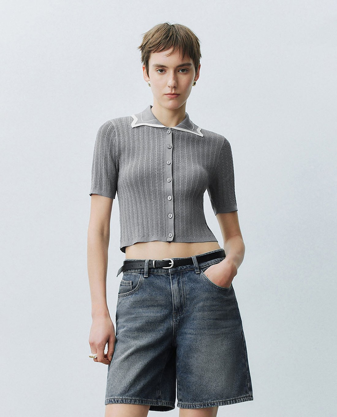 - Tay ngắn, cổ bẻ bo viền kẻ màu tương phản