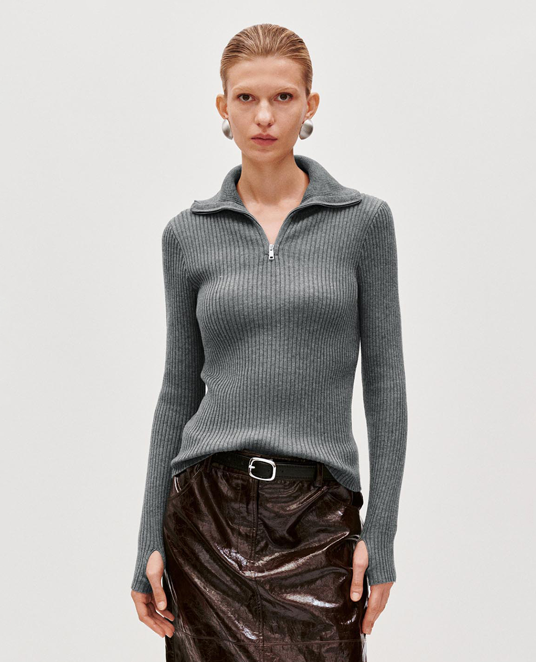 Áo dệt kim nữ cổ bẻ phối khóa kéo