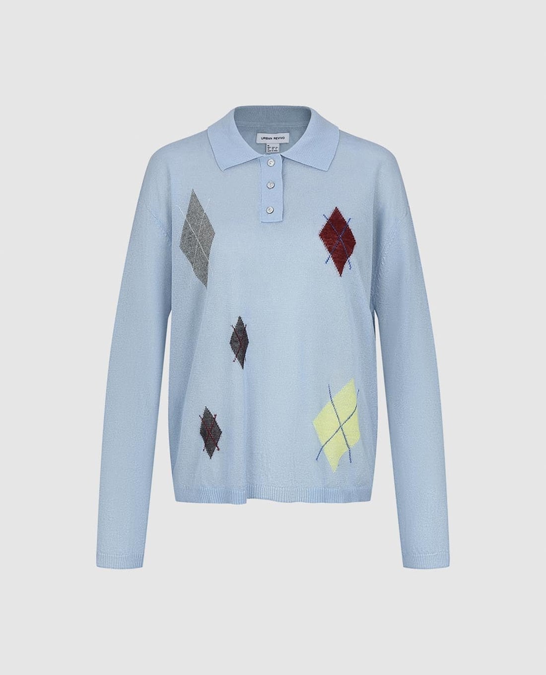 Áo dệt kim nữ cổ bẻ tay dài phối họa tiết