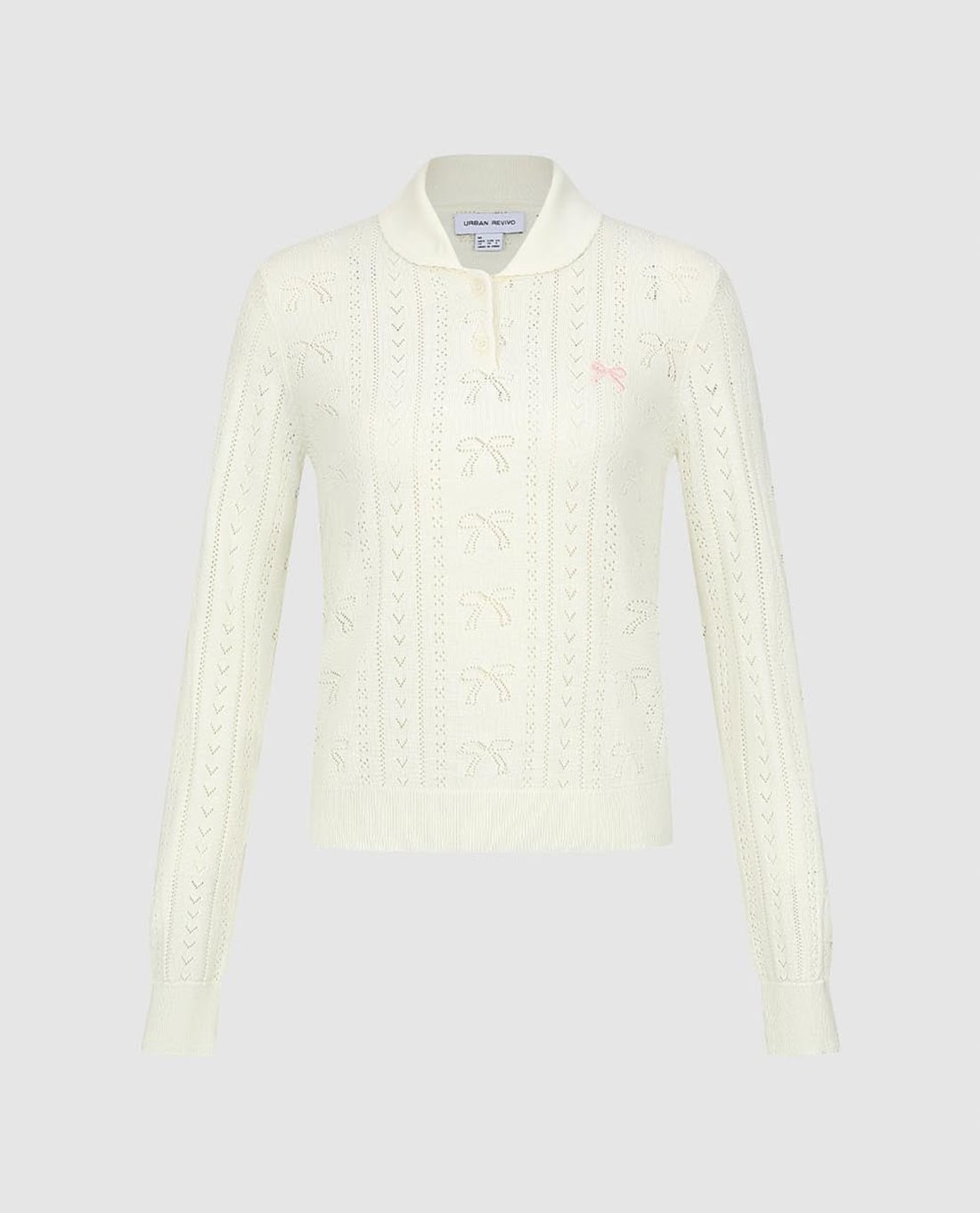 Áo dệt kim nữ cổ bẻ tay dài phối nơ