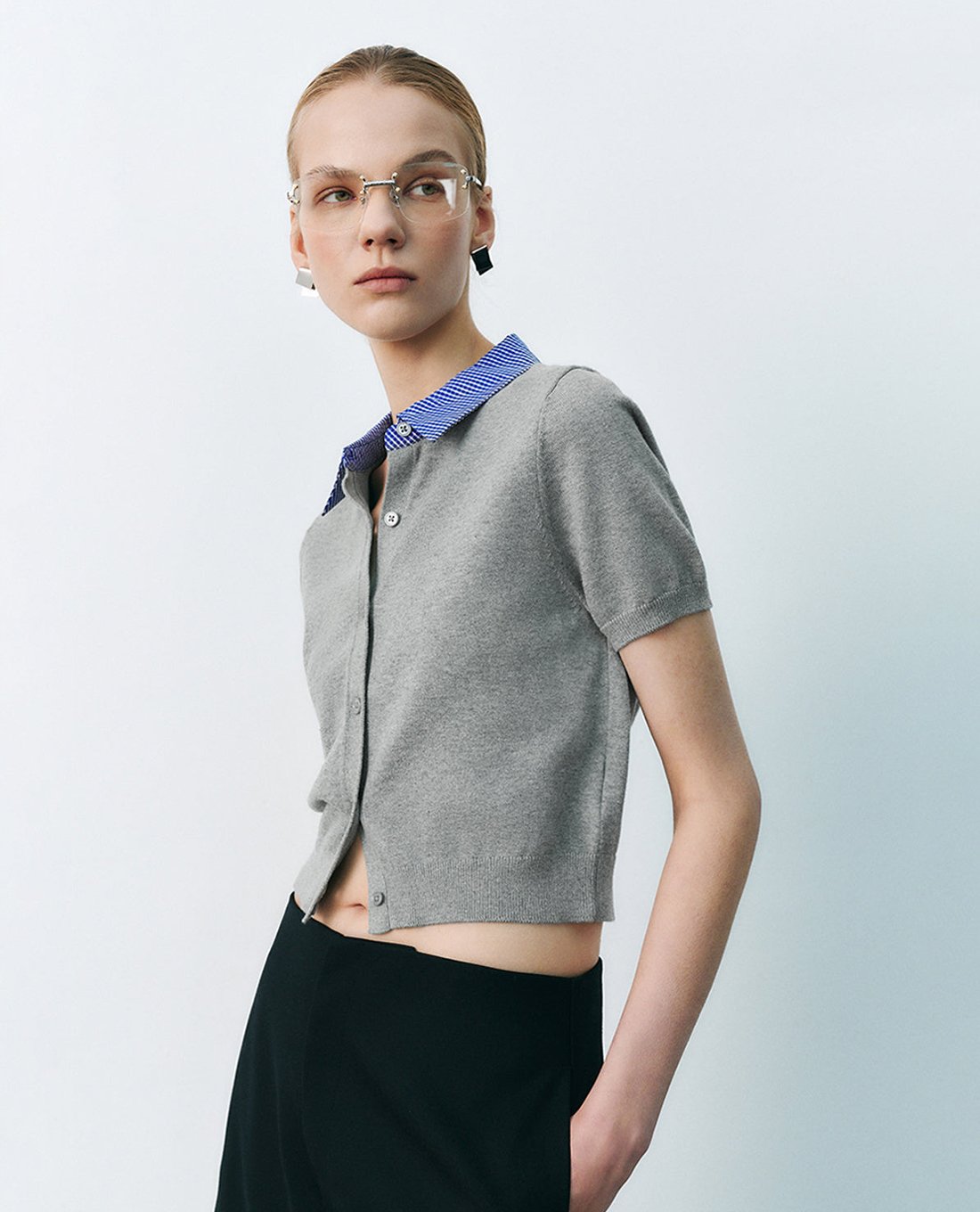 Áo dệt kim nữ cổ bẻ tay ngắn cá tính