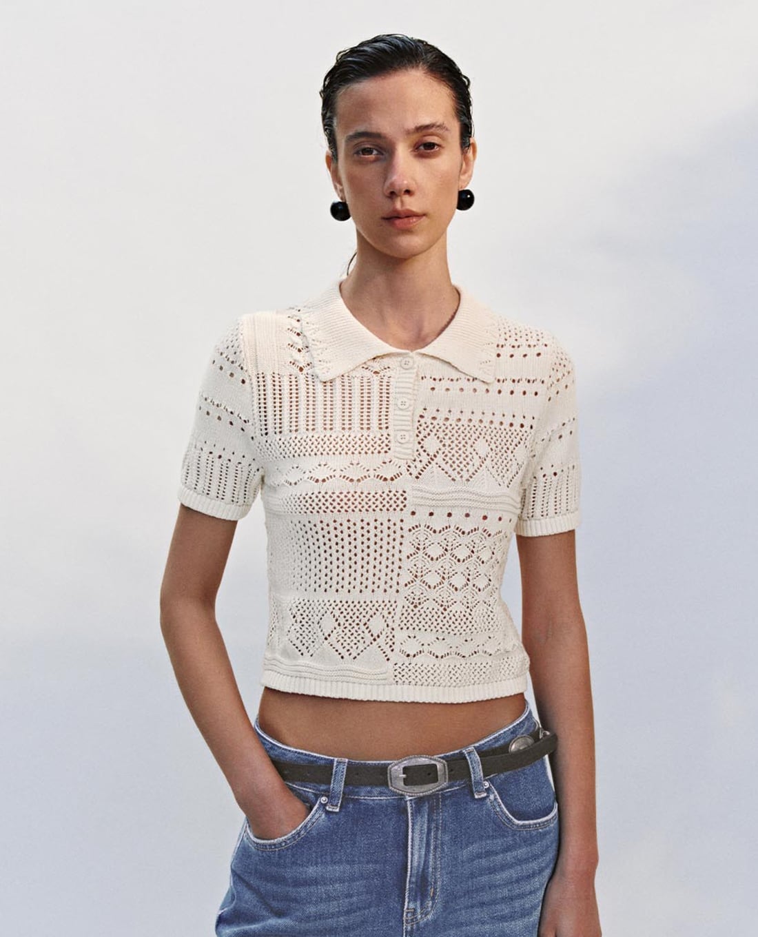 Áo dệt kim nữ cổ bẻ tay ngắn họa tiết đục lỗ