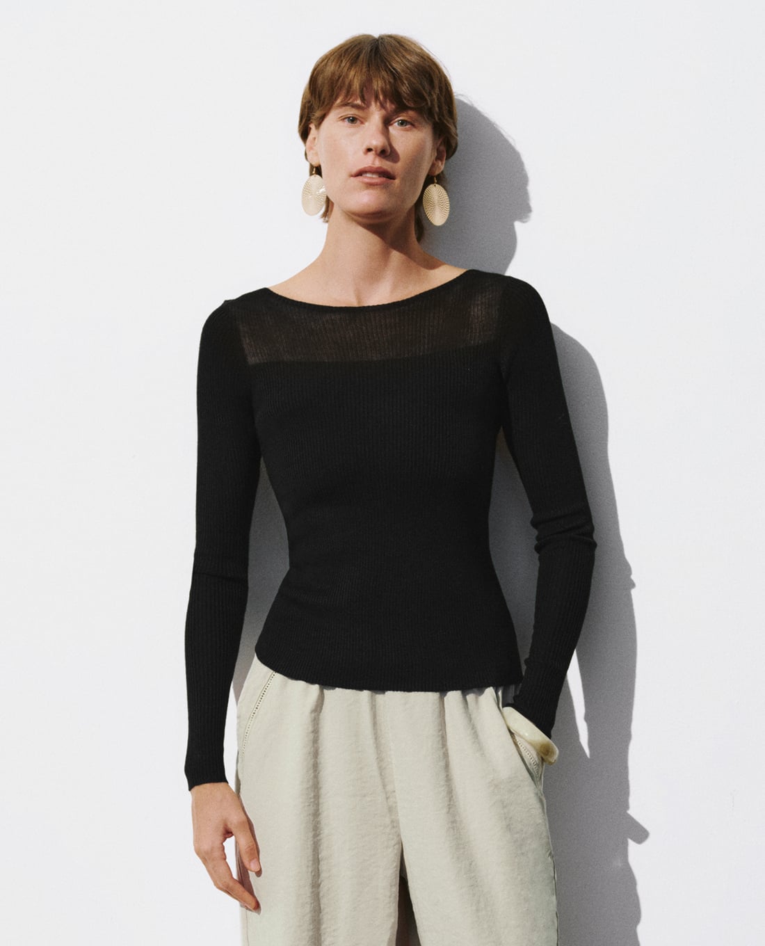 Áo dệt kim nữ cổ thuyền tay dài phom ôm