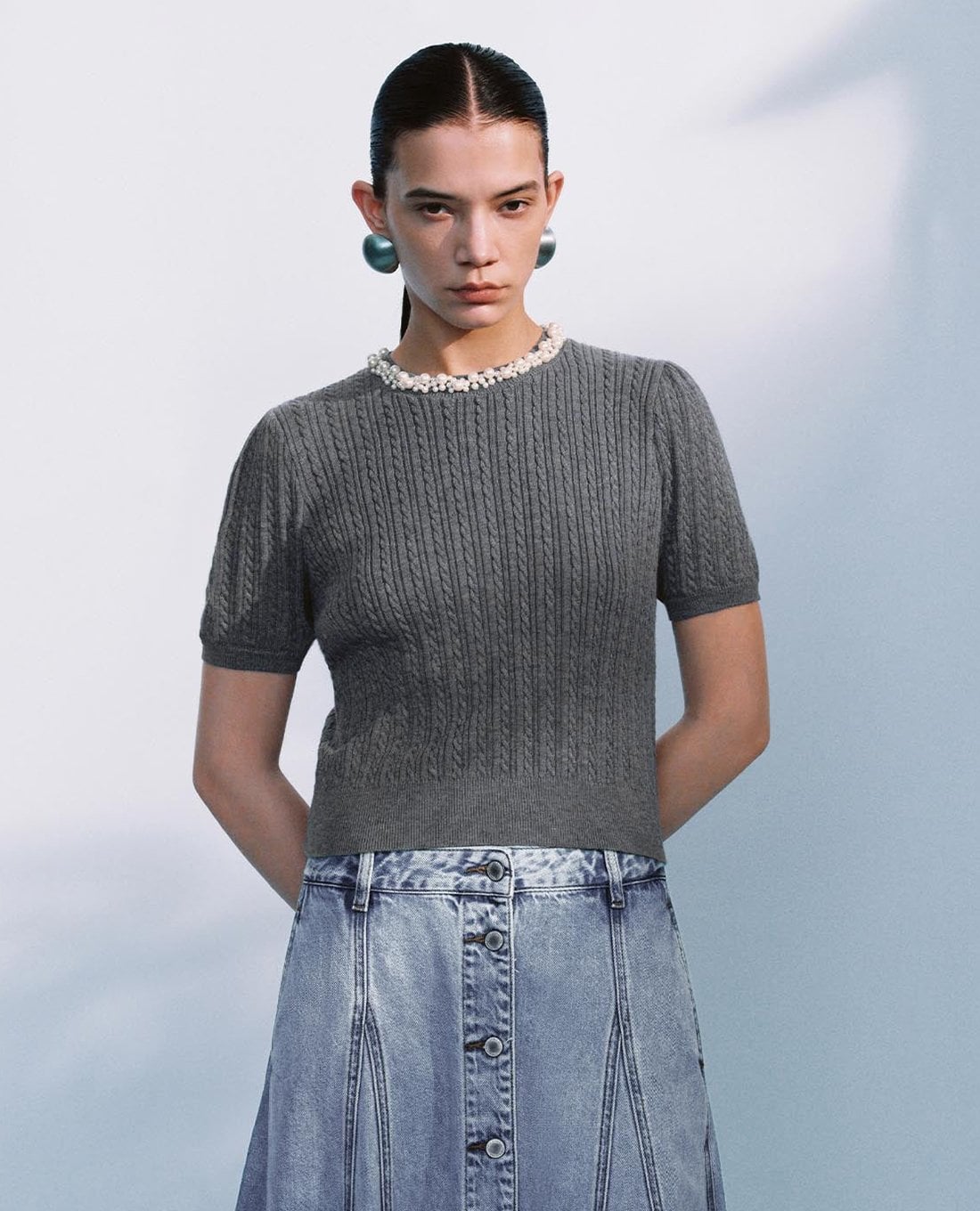Áo dệt kim nữ cổ tròn đính ngọc trai