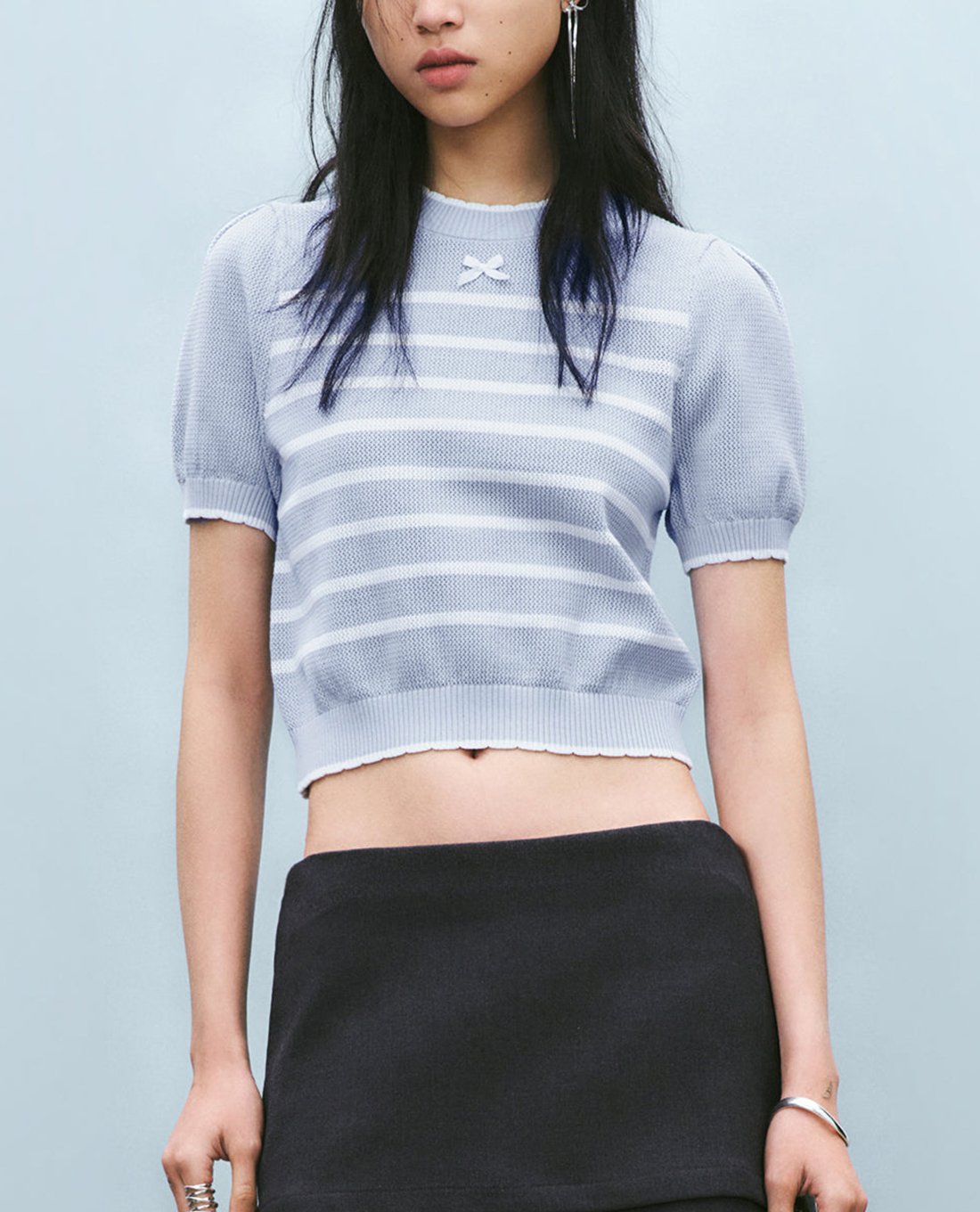 Áo dệt kim nữ cổ tròn sọc ngang phối nơ
