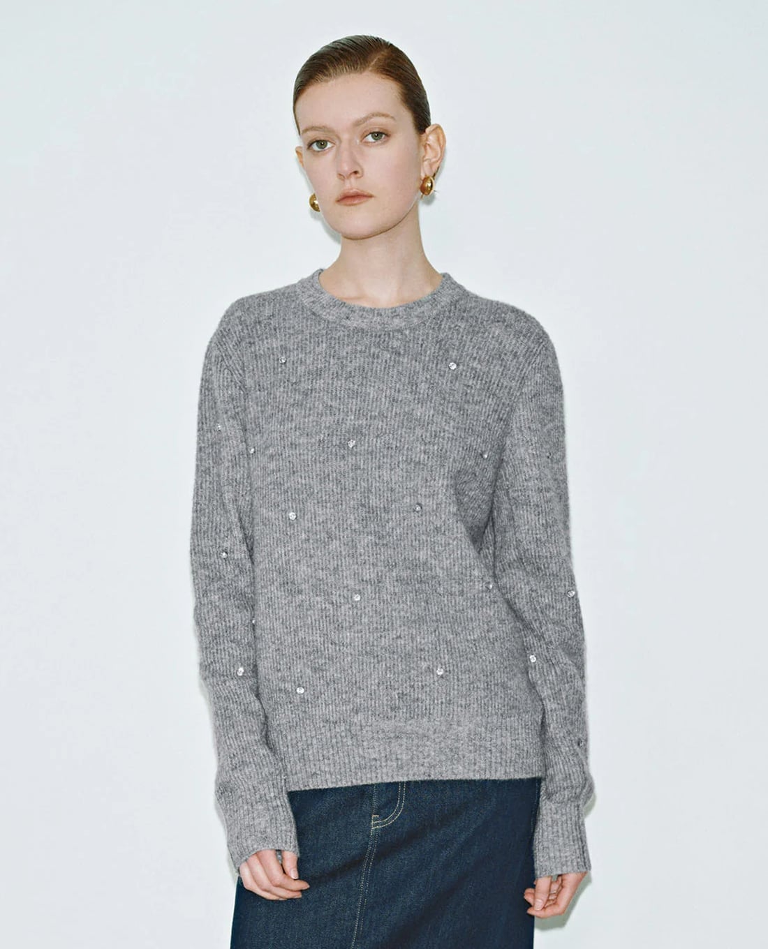 Áo dệt kim nữ cổ tròn tay dài đính đá