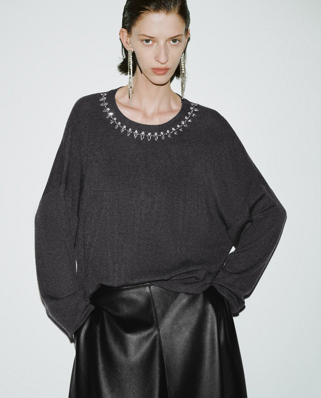 Áo dệt kim nữ cổ tròn tay dài Loose