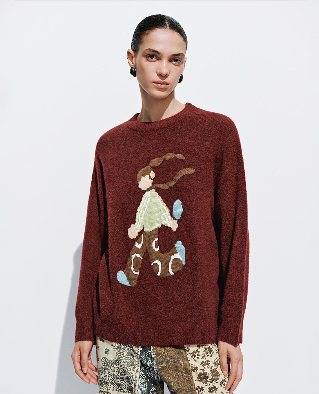 Áo dệt kim nữ cổ tròn tay dài phối họa tiết