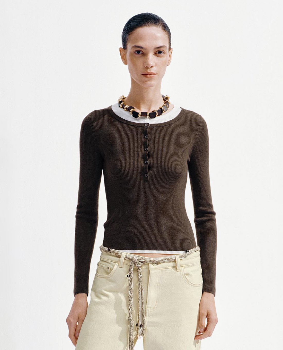 Áo dệt kim nữ cổ tròn tay dài phối viền