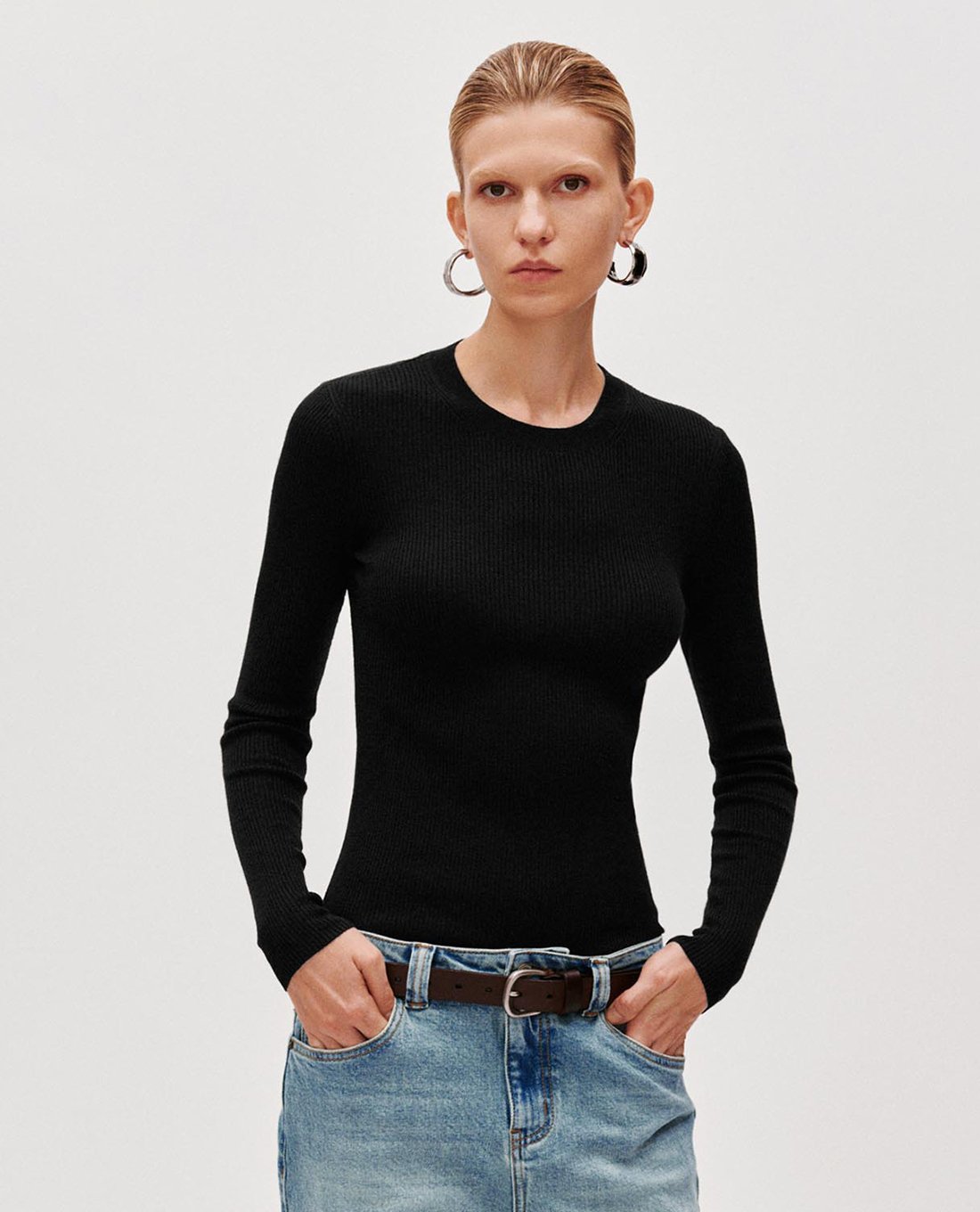 Áo dệt kim nữ cổ tròn tay dài phom ôm