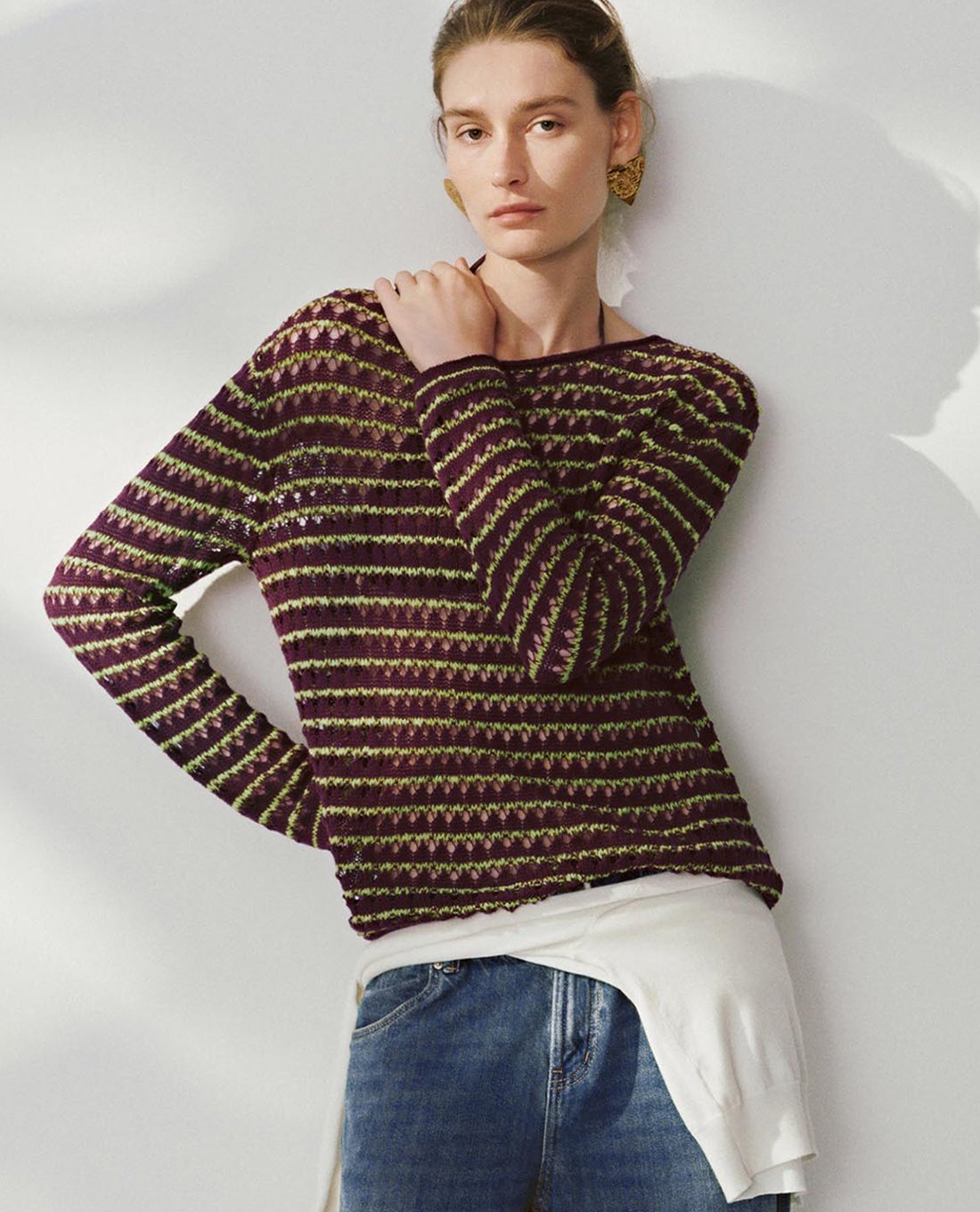 Áo dệt kim nữ cổ tròn tay dài sọc ngang