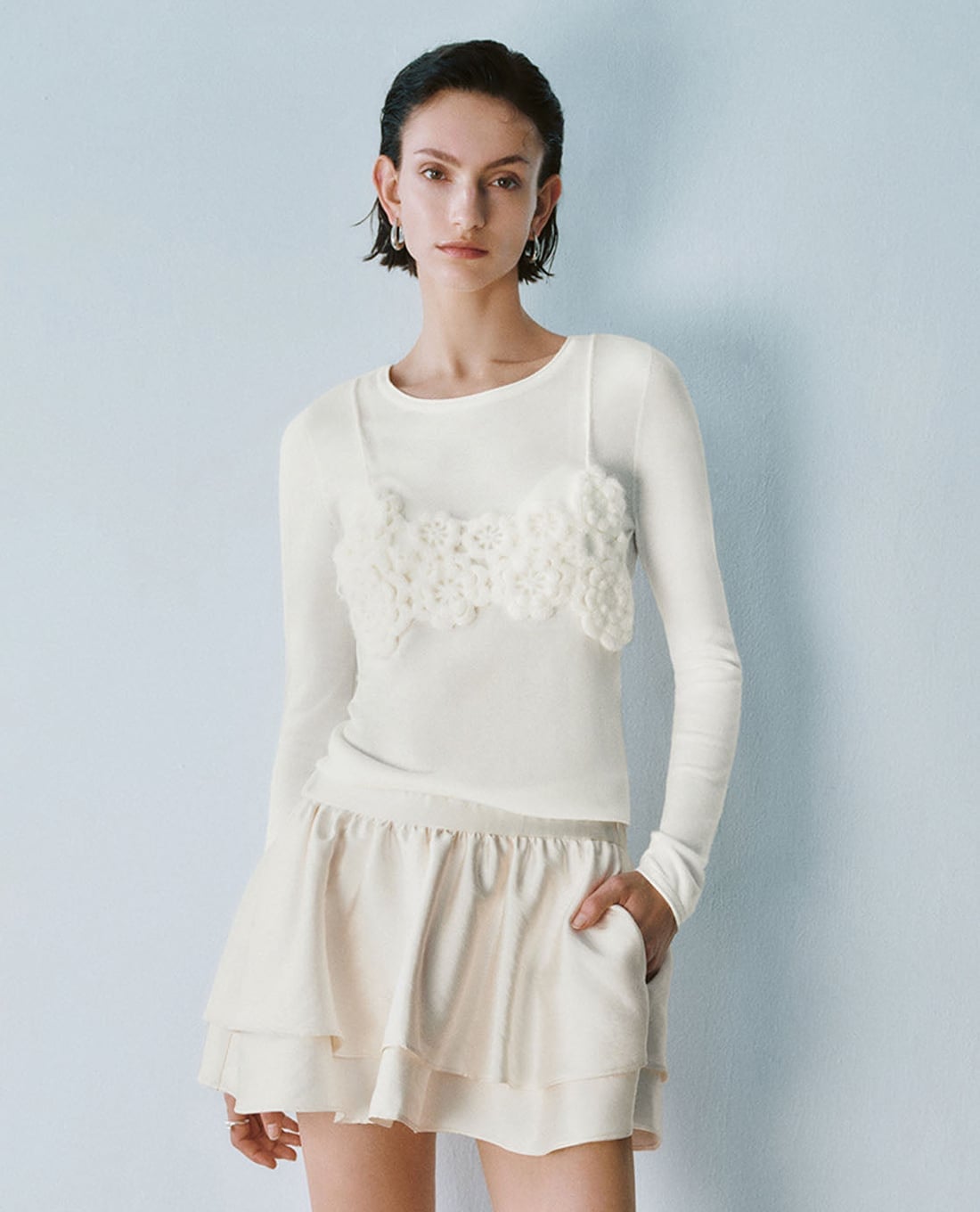 - Điểm nhấn hoa nổi 3D trước ngực tạo hiệu ứng mềm mại