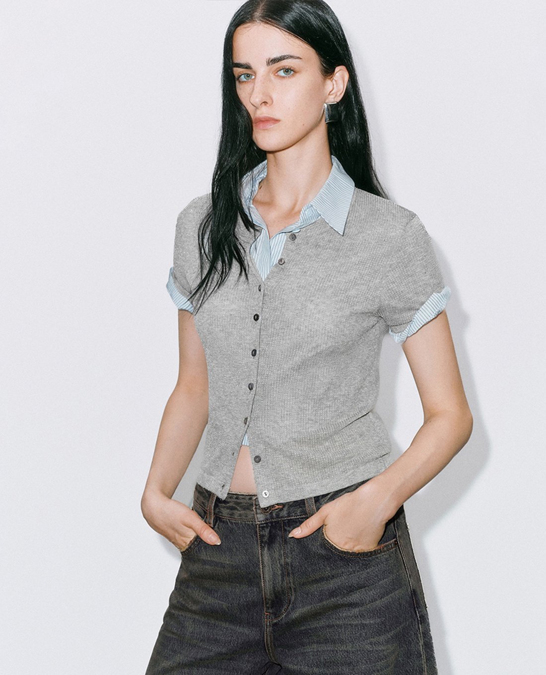 Áo dệt kim nữ cổ tròn tay ngắn phối nút