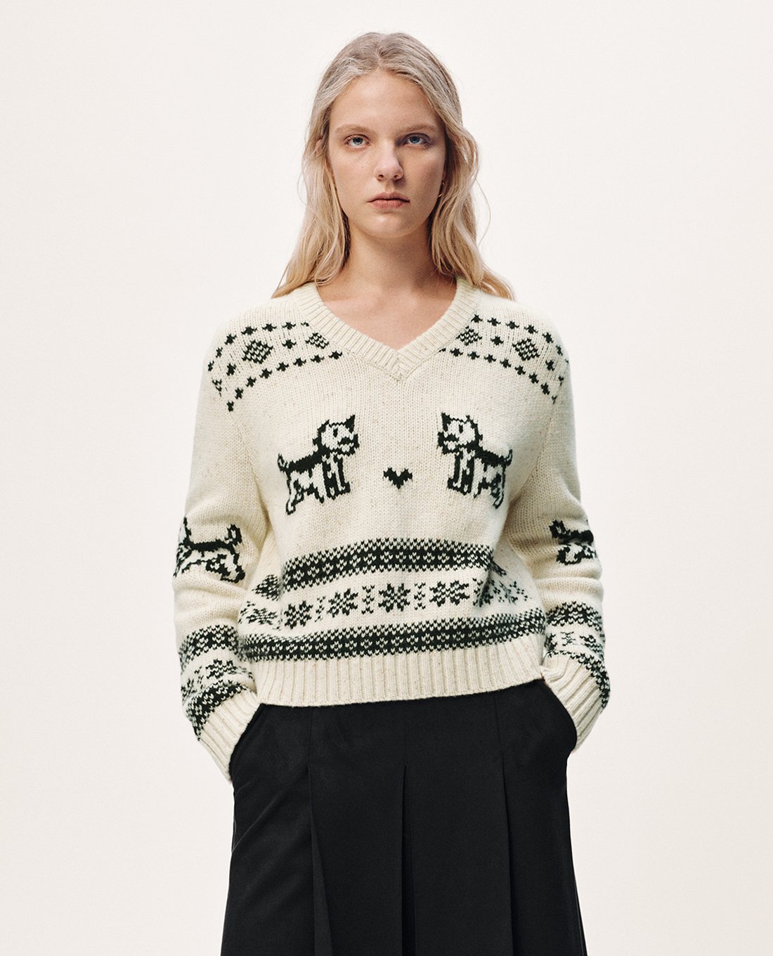 - Thiết kế cổ V cùng họa tiết mèo và hoa tuyết đậm chất Bắc Âu