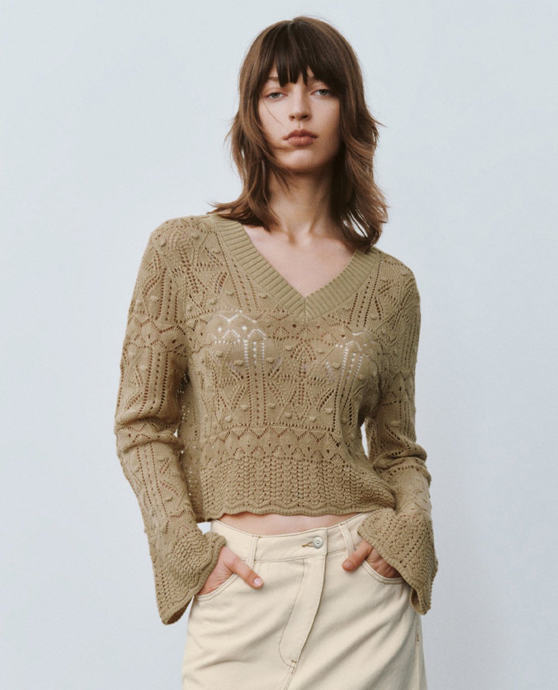 - Thiết kế cổ chữ V và ống tay loe tao nhã