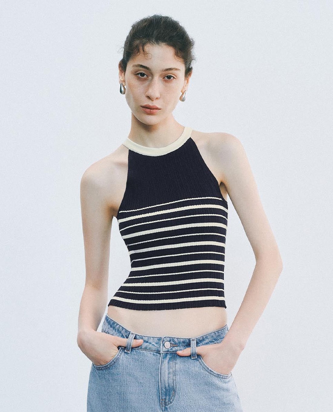 Áo dệt kim nữ cổ yếm phối sọc ngang