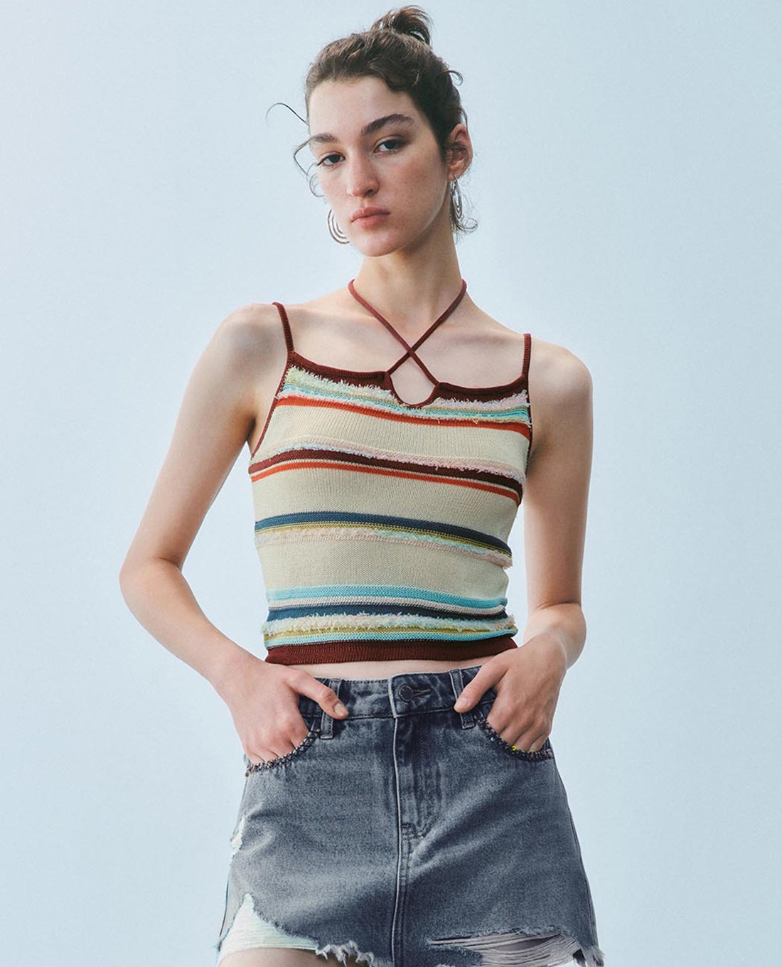Áo dệt kim nữ hai dây phối màu thời thượng