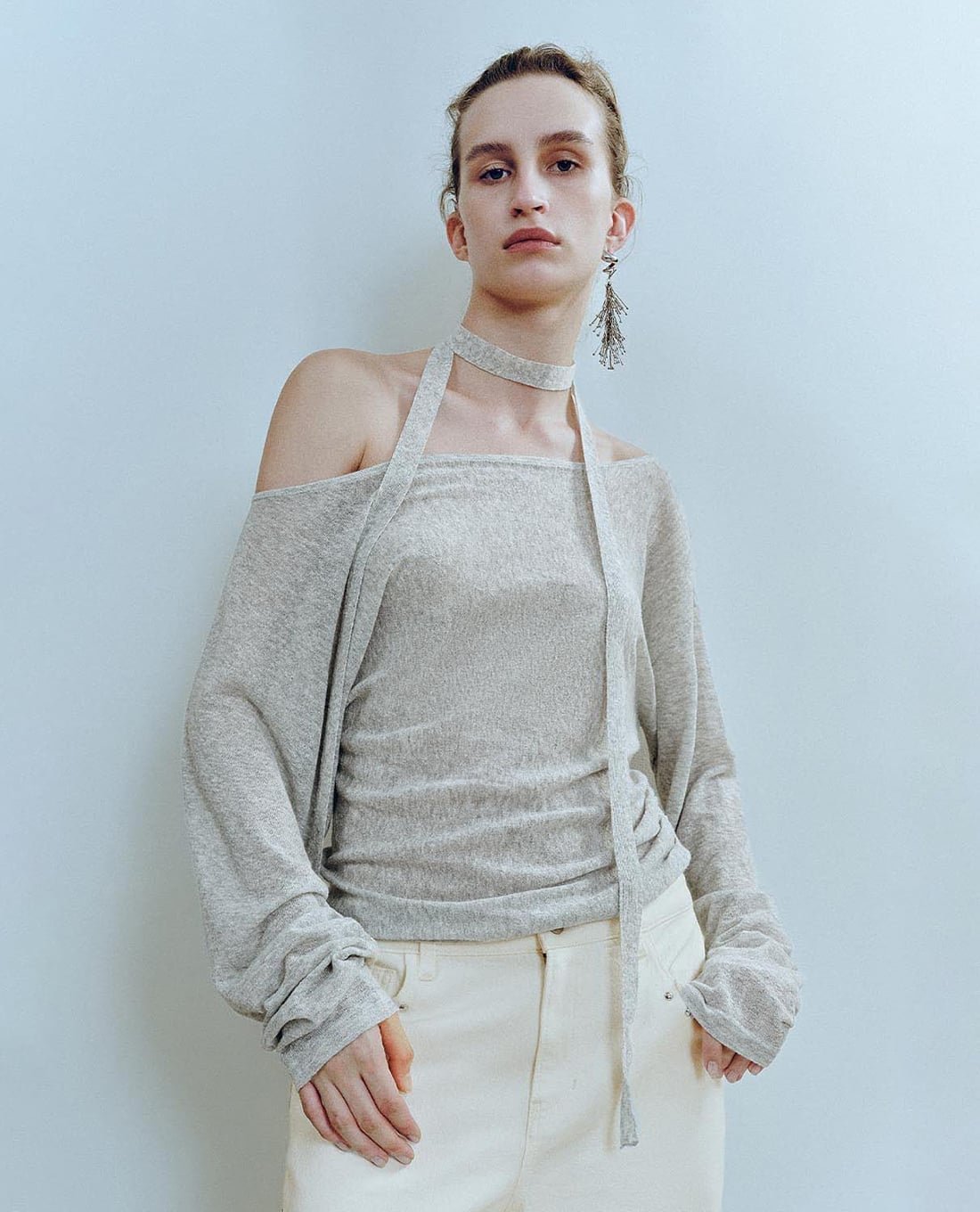 Áo dệt kim nữ lệch vai phối dây choàng cổ