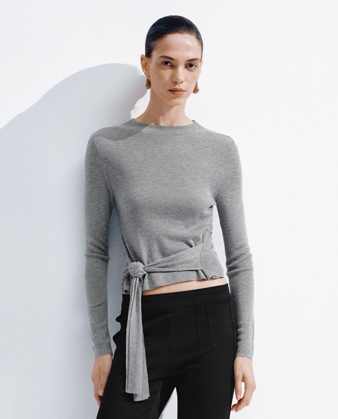- Thiết kế cổ tròn kết hợp chi tiết buộc nơ bên hông tạo điểm nhấn