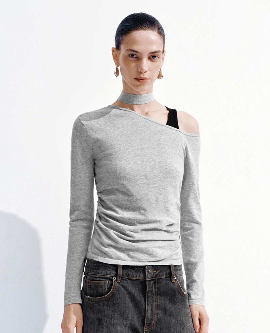 - Thiết kế lệch vai kết hợp chi tiết vòng cổ tạo điểm nhấn độc đáo