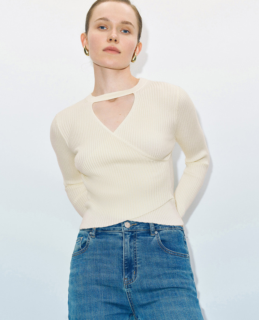 Áo dệt kim nữ tay dài phom ôm Keyhole