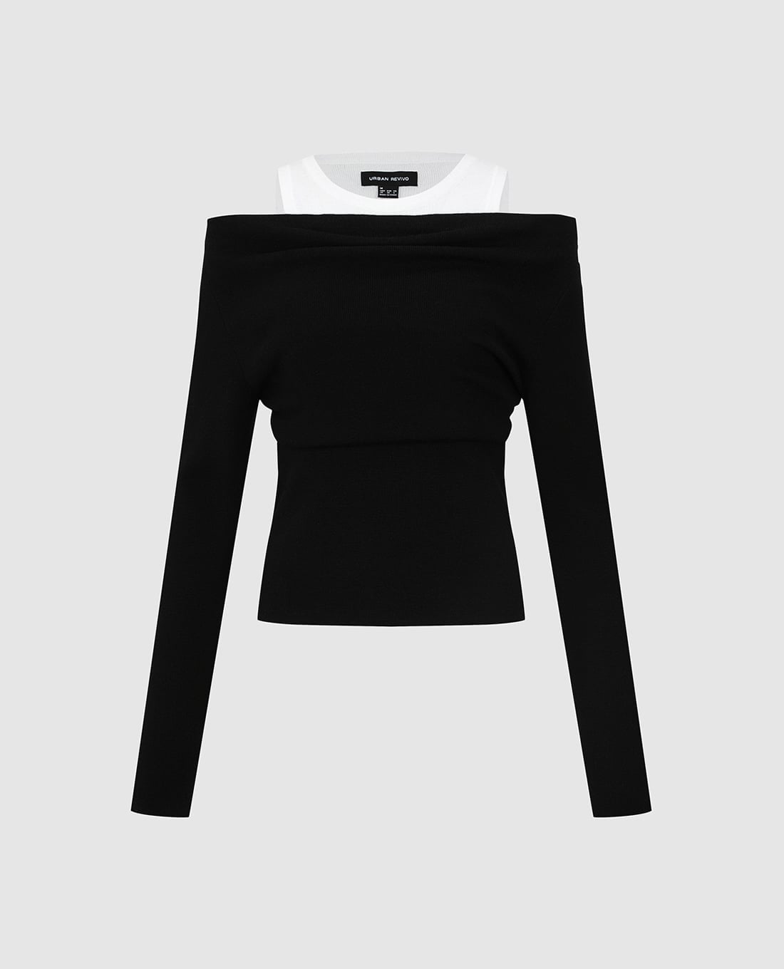 Áo dệt kim nữ trễ vai tay dài phối layer