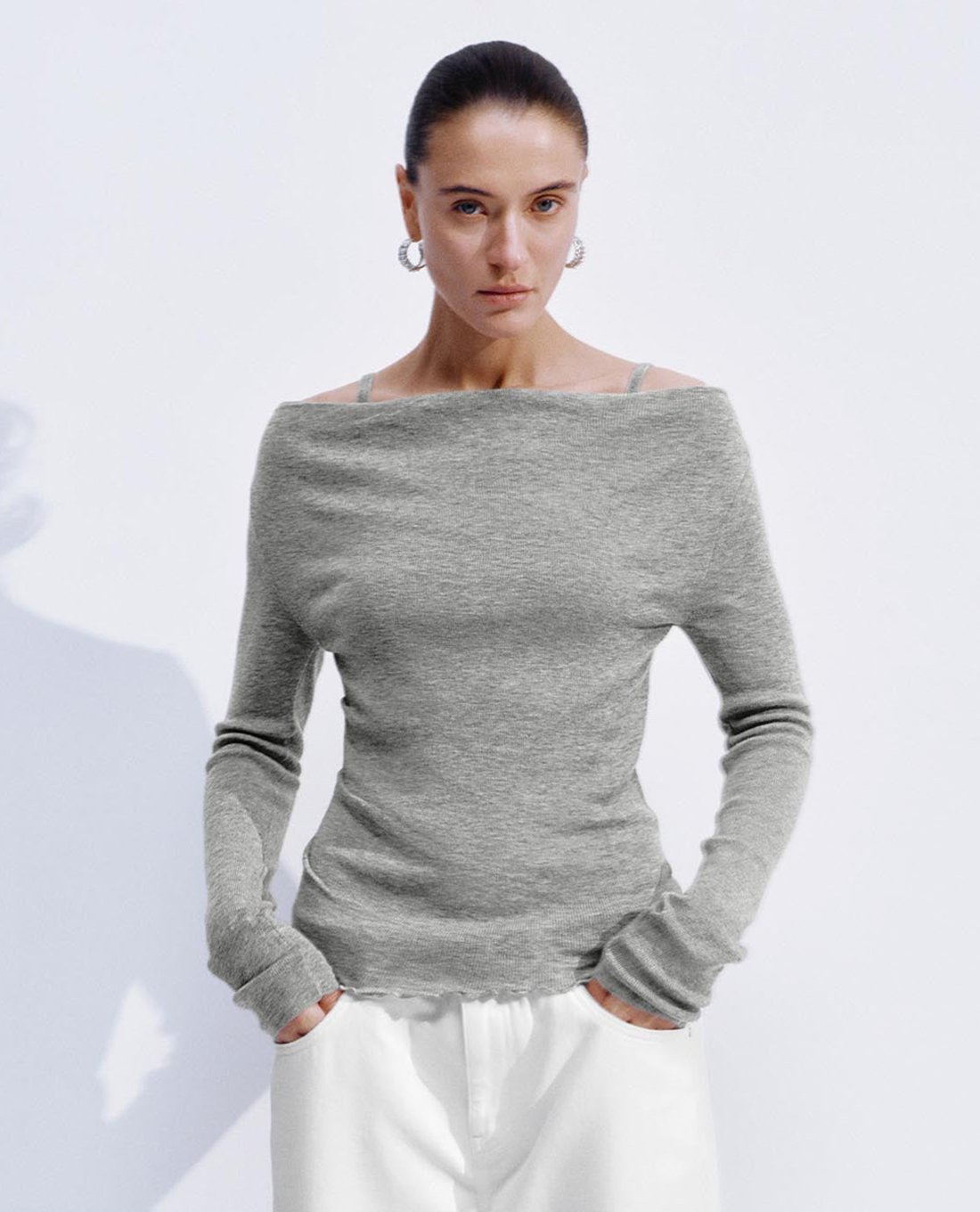 Áo dệt kim nữ trễ vai tay dài phom ôm