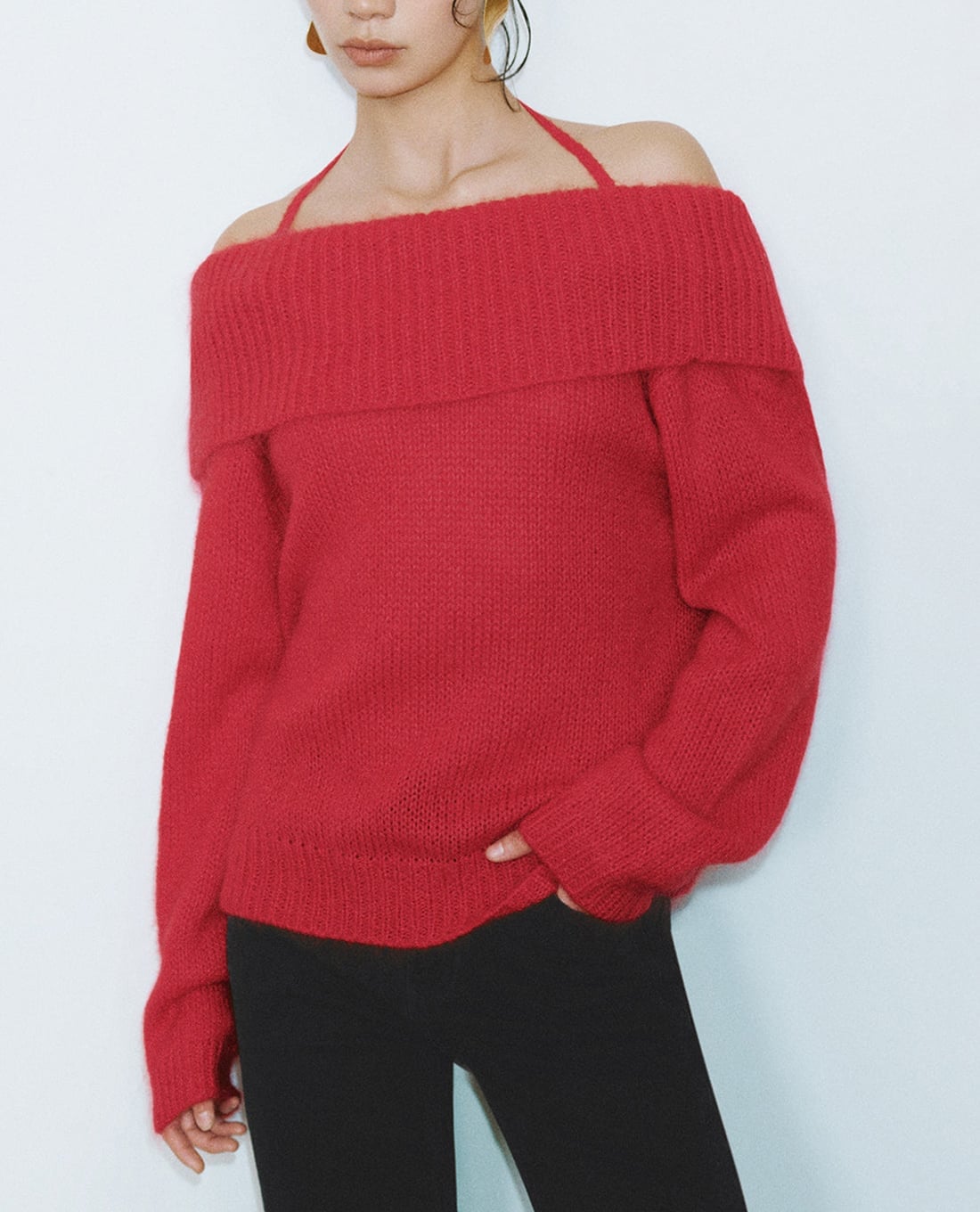 Áo dệt kim nữ trễ vai tay dài phom rộng
