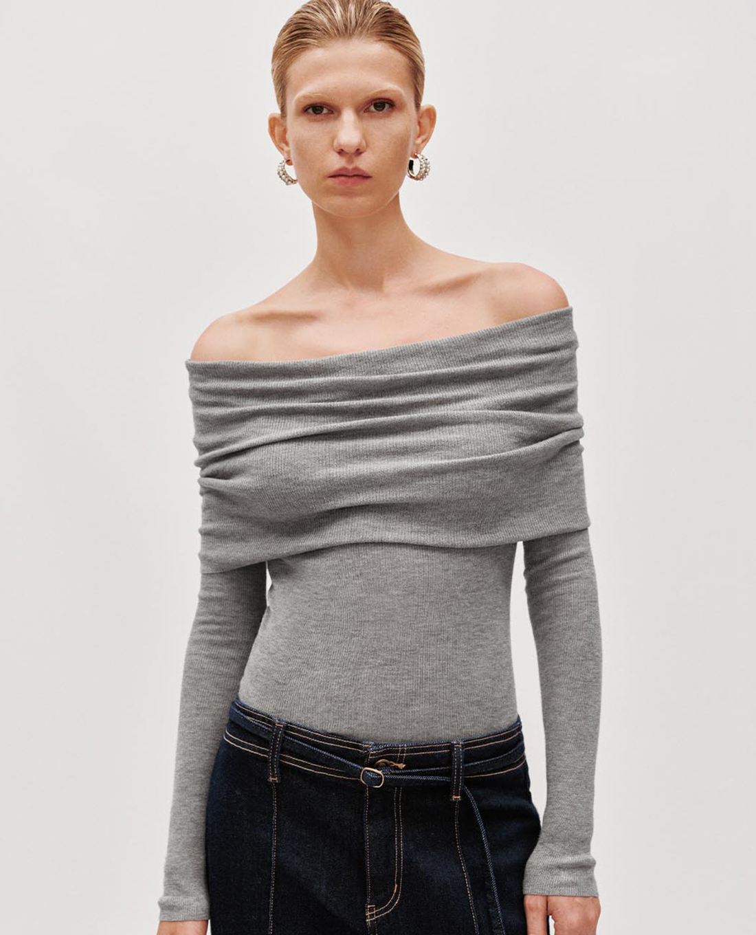 Áo dệt kim nữ trễ vai tay dài xếp li