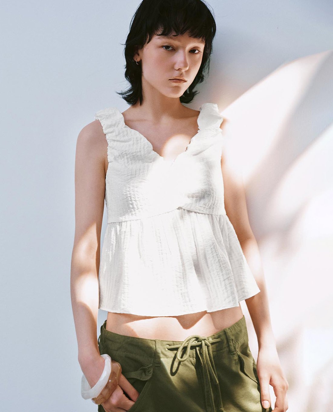 - Áo hai dây bản to với phần dây vai nhún bèo nhẹ nữ tính