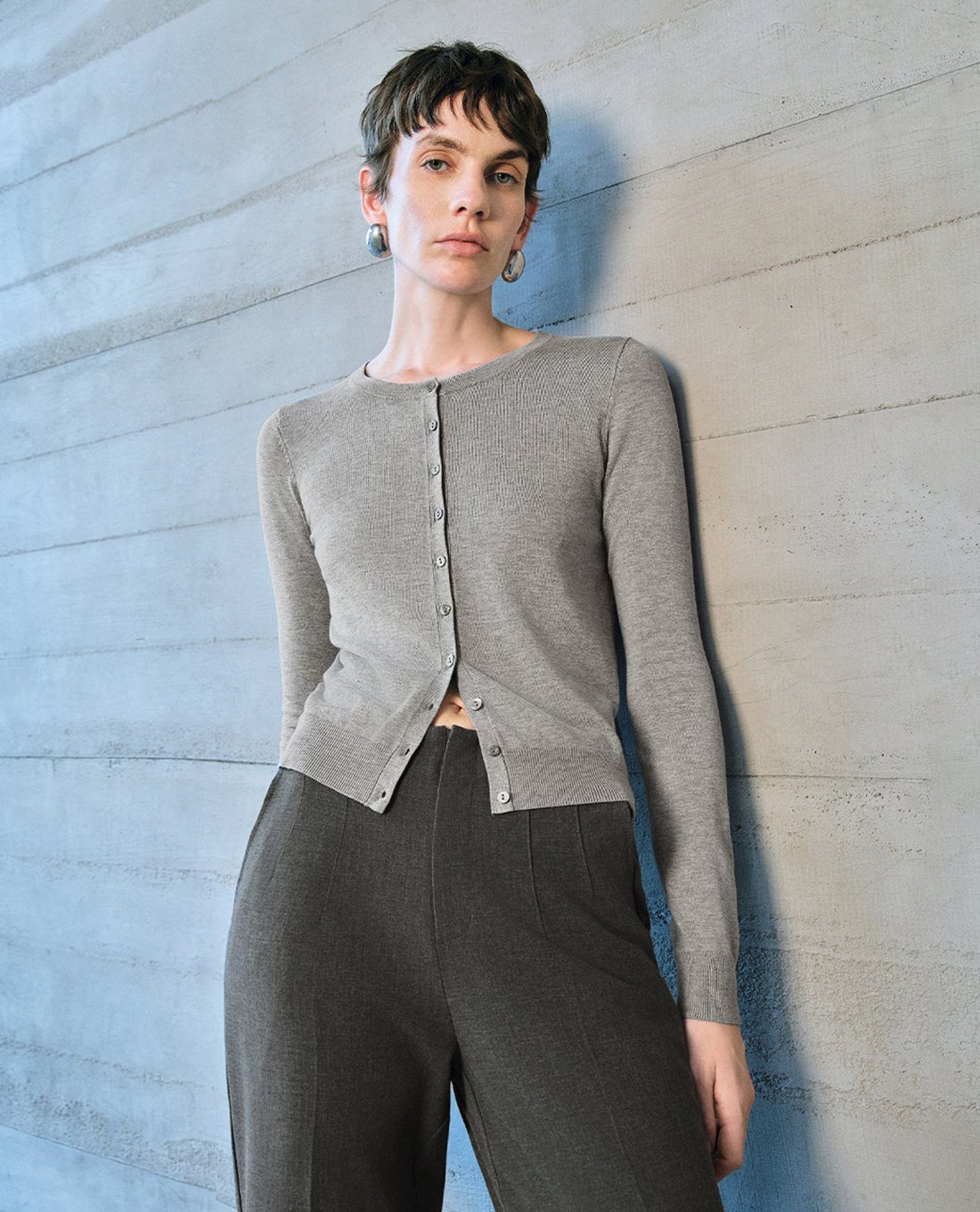 Áo khoác cardigan nữ cổ tròn ta dài phối nút hiện đại
