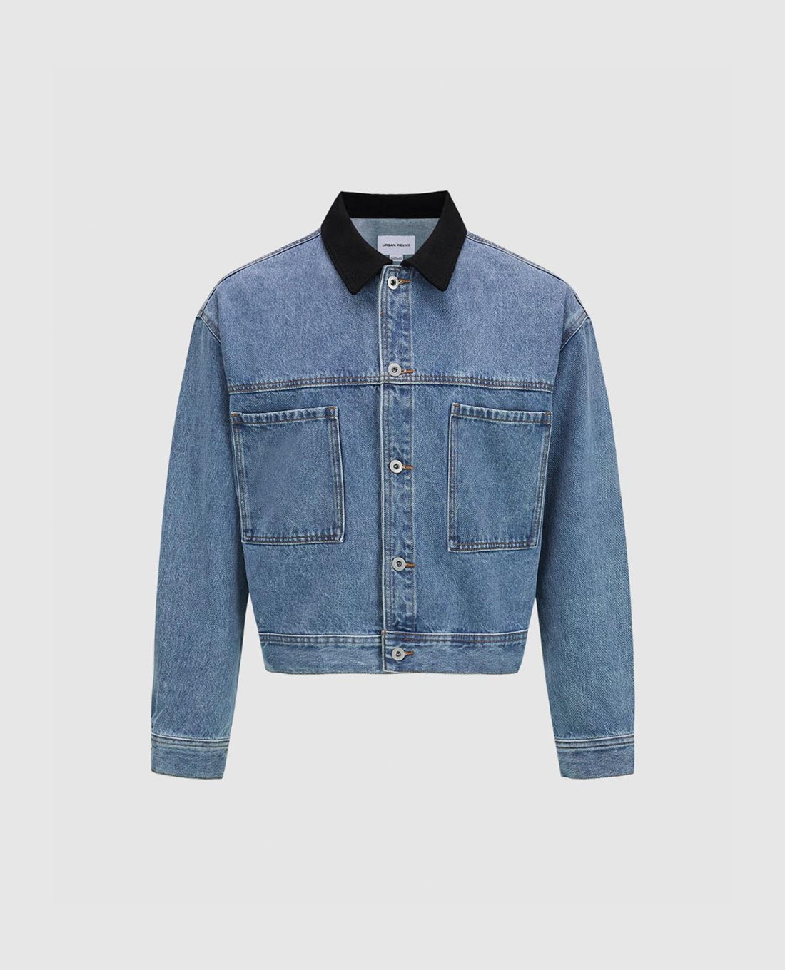 - Thiết kế denim cổ điển với cổ áo đen nổi bật