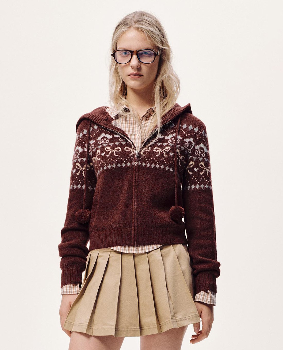 Áo khoác dệt kim nữ phối mũ họa tiết nordic