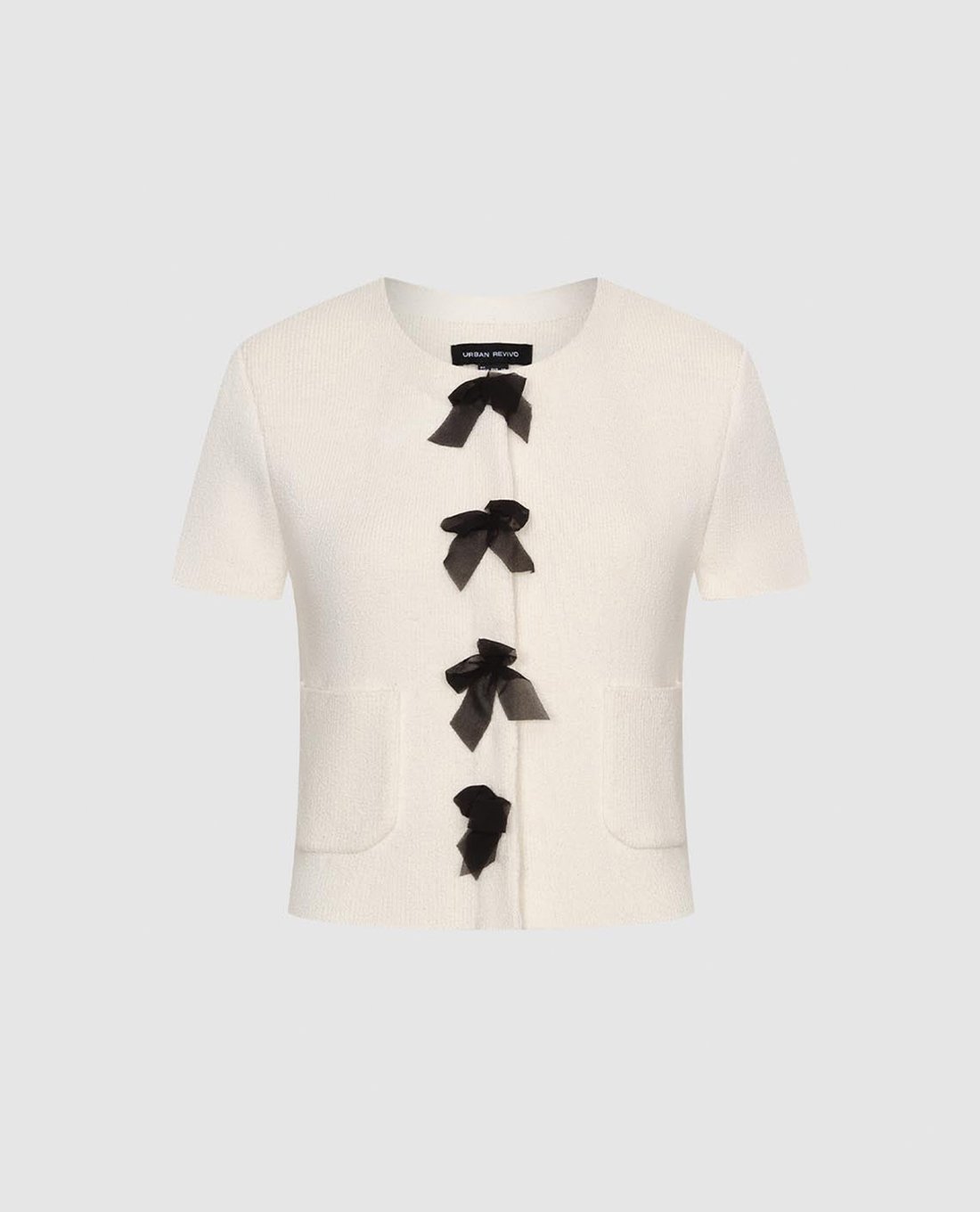 Áo khoác dệt kim nữ tay ngắn phối nơ