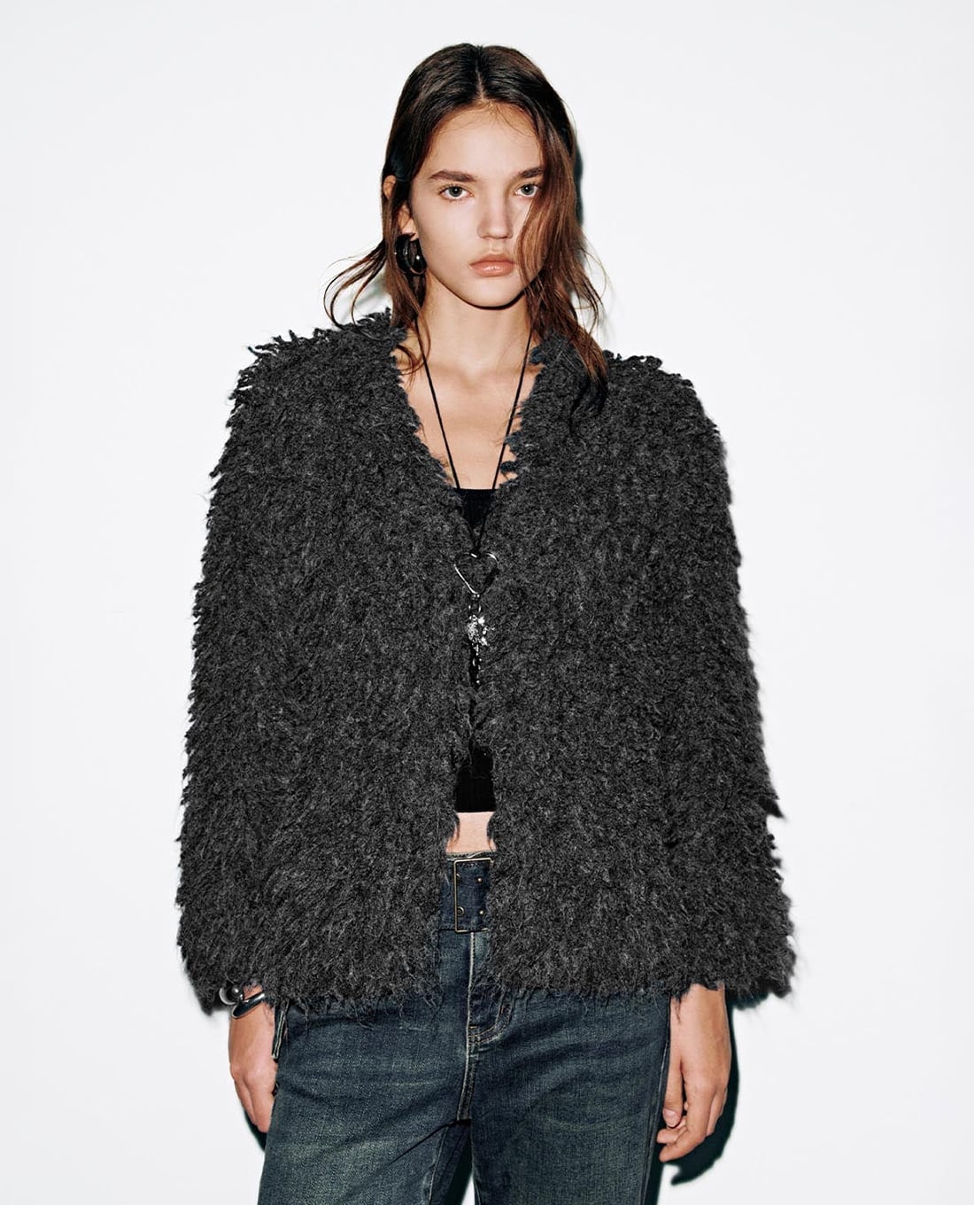 - Thiết kế áo khoác lông xù dày dặn tạo hiệu ứng thị giác nổi bật