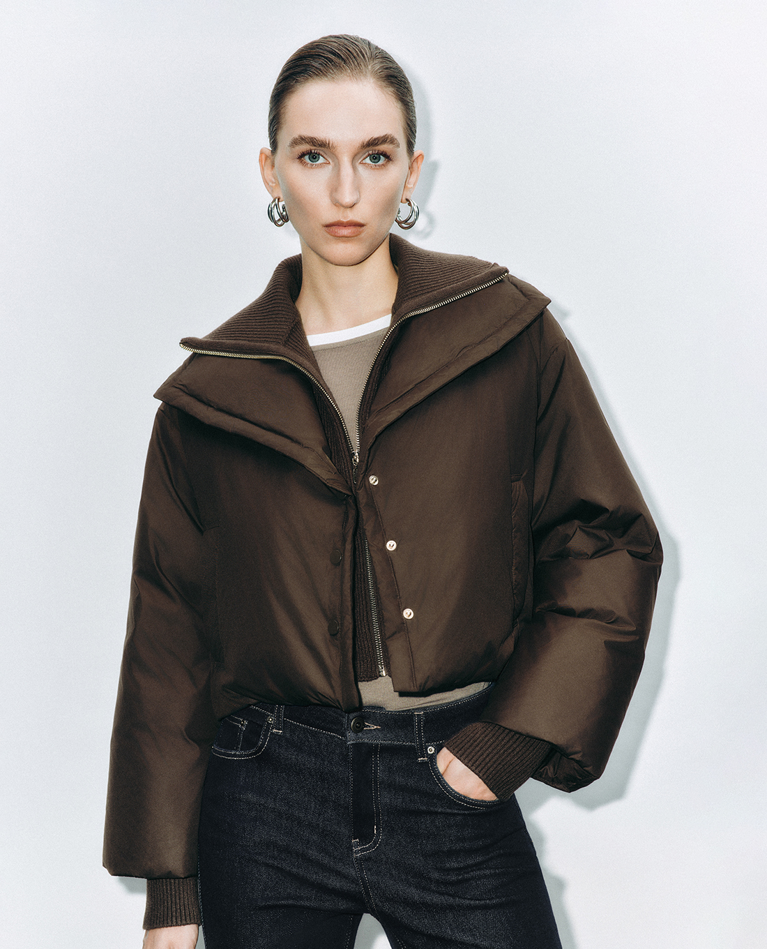 Áo khoác phao nữ cổ bẻ xếp lớp phom croptop
