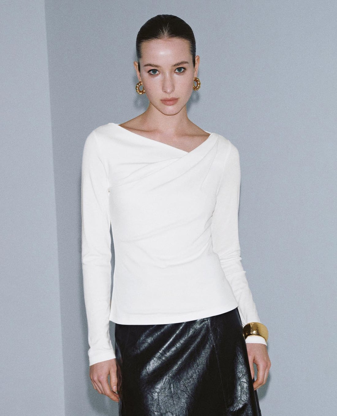 Áo kiểu nữ cổ chéo tay dài bất đối xứng