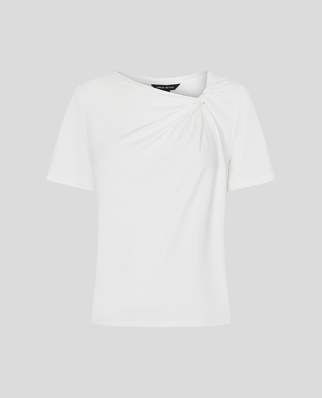 - Thiết kế cổ tròn nhún lệch vai tinh tế