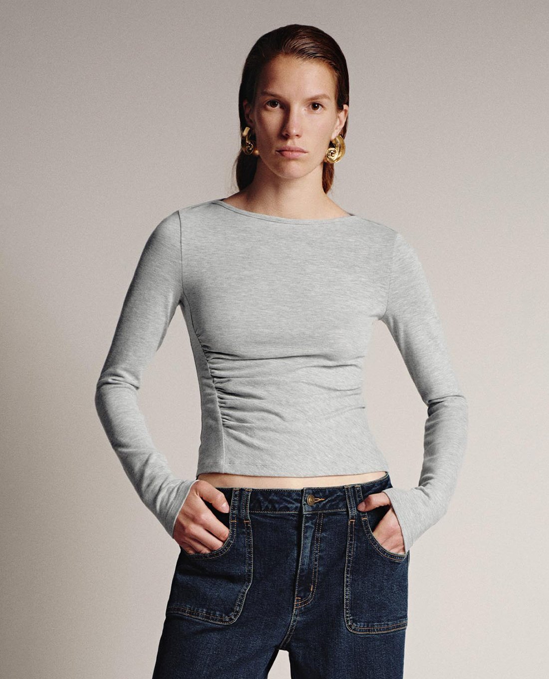 - Tay dài và cổ tròn tối giản, dễ phối với mọi trang phục