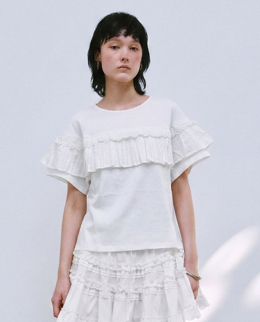- Thiết kế tay ngắn phối bèo mềm mại, bay bổng