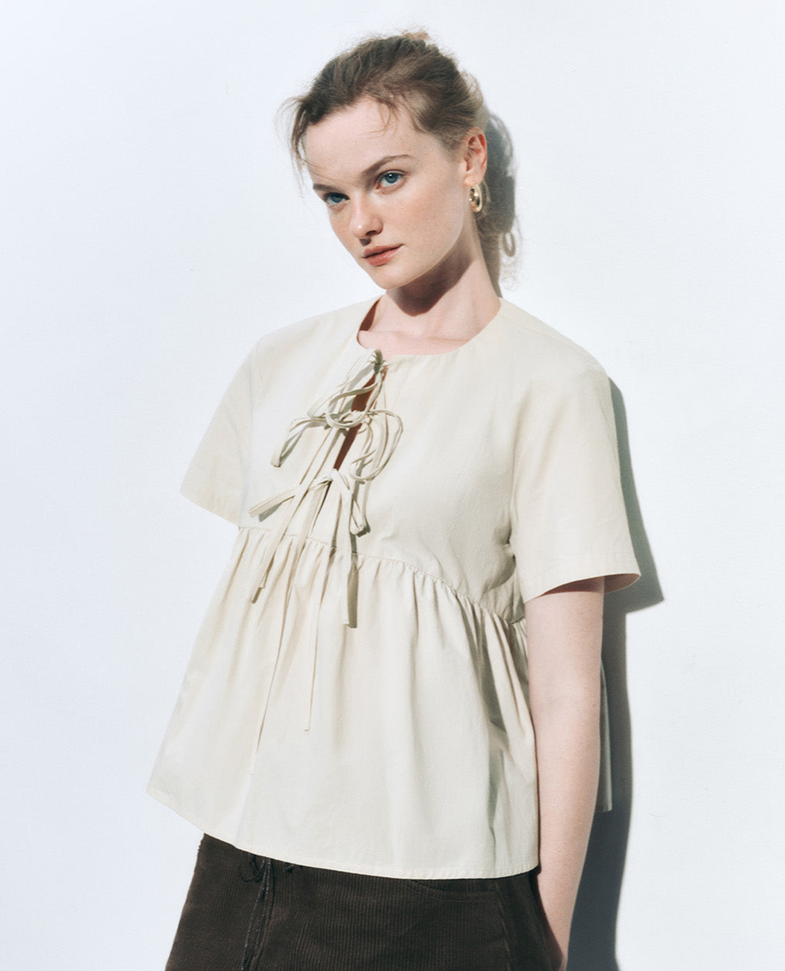 Áo kiểu nữ cổ tròn tay ngắn dáng xoè Lace Up