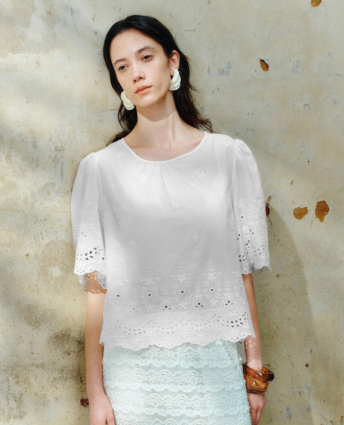 Áo kiểu nữ cổ tròn tay ngắn họa tiết ren